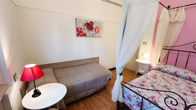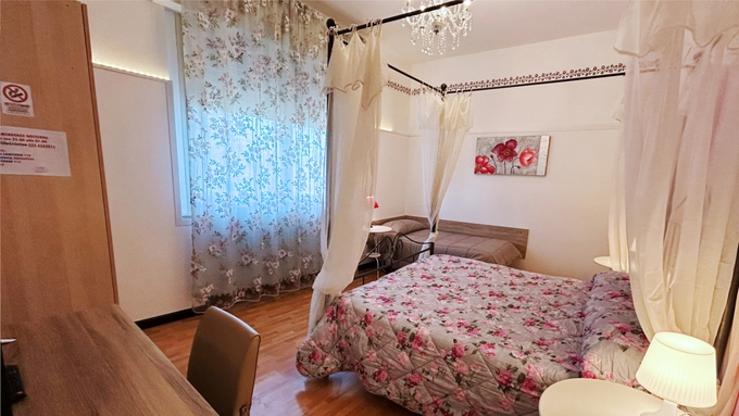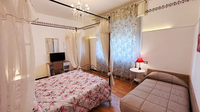 Situata al primo piano, stanza Matrimoniale (+ letto singolo), molto romantica con letto a baldacchino. Ideale per la coppia ma anche per la famiglia. Silenziosa perché dotata di infissi di ultima generazione.