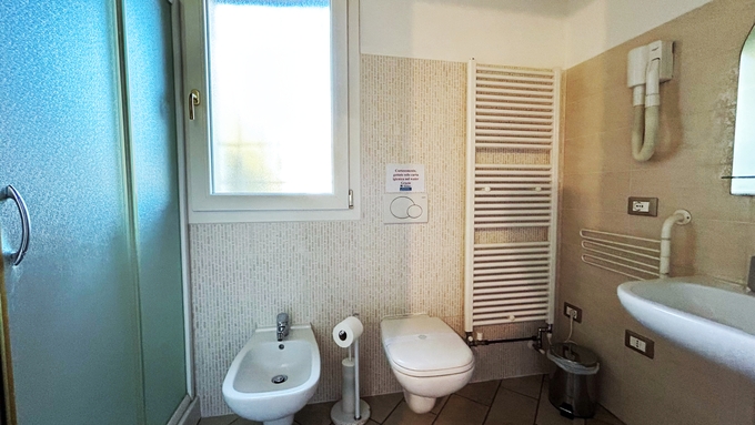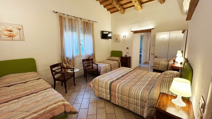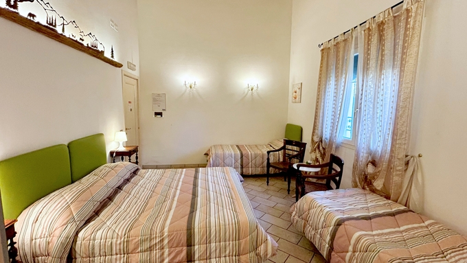 Situata al piano terra, stanza molto ampia già predisposta con 4 posti letto (letto matrimoniale + 2 letti singoli). Situata al piano terra con ampio disimpegno dotato di una mini cucina (che può essere utilizzata con a richiesta con un costo aggiuntivo di €5 al giorno). La stanza si affaccia direttamente su un ampio giardino esposto a est. All’esterno è dotato di sedie e tavolino per godersi un pò di relax in totale tranquillità. Silenziosa perché dotata di infissi di ultima generazione. Gli animali sono ammessi al costo di €10 per la prima notte e €5 per le successive notti.